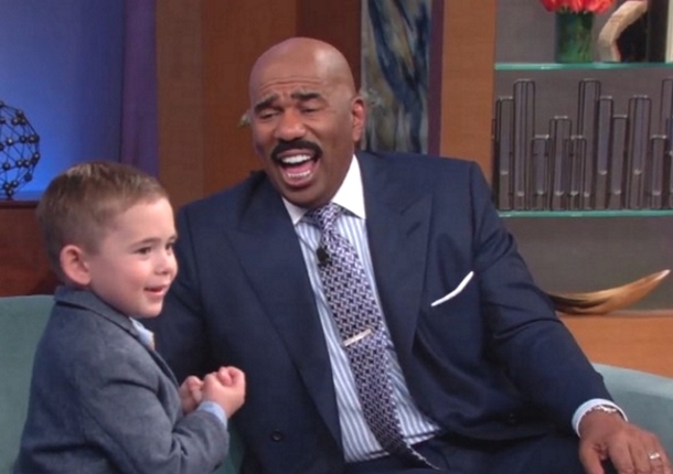 Steve Harvey got his start doing stand-up comedy, but he’s met his match in this cheeky tyke. At the beginning of the interview, Steve doubled over in laughter and could barely catch his breath after Tommy informed him that his brother, Jack, has a girlfriend – but, Jack won’t share her with him.