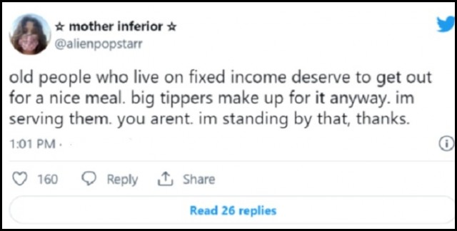 King was quick to jump to the widow’s defense. She responded by explaining that the woman’s meal cost $11 and she left a $3 tip. She also added, “Not everyone can afford to tip well.” When someone took issue with that statement, King again defended the woman. “Old people who live on fixed income deserve to get out for a nice meal,” the waitress declared. “Big tippers make up for it anyway. I’m serving them. You aren’t. I’m standing by that, thanks,” she said, shutting down the criticism.